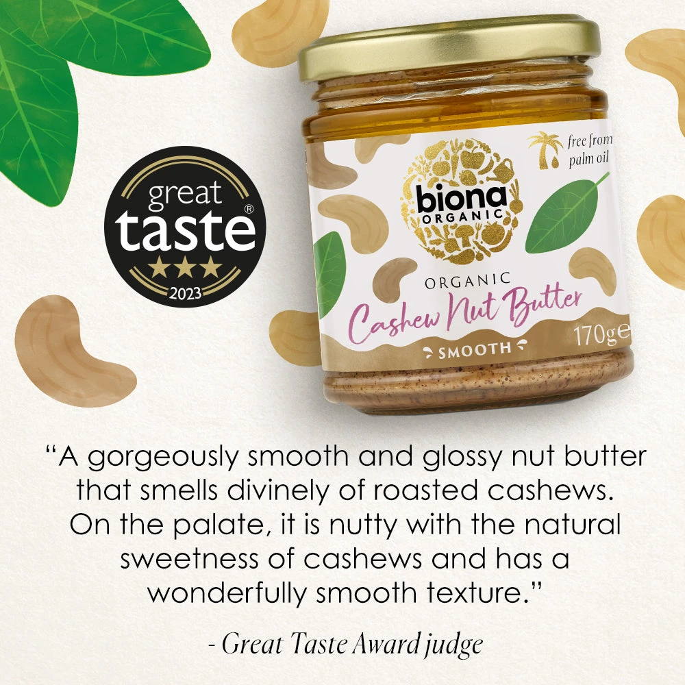 Biona Organic Cashew Nut Butter is milled from small batches of freshly roasted, certified organic nuts – and that’s it! We don’t use palm fat or emulsifiers, only the whole nut which means you receive their nutritious goodness and taste. Cashew Butter is perhaps the creamiest of all the nut butters and makes a great change from Peanut or Almond. It is delicious spread liberally over hot toast and topped with banana for a hearty morning start and serves as a great afternoon pick me up when spread over crackers. It’s distinctive velvety consistency works wonders in smoothies, raw desserts and it can even be used as a replacement for traditional cream to decorate cakes. With nothing but 100% whole roasted Cashew Nuts inside, the nut oil may separate on occasion but this does not affect the quality of the product. Simply stir to restore to its natural consistency and enjoy! For best results, store in a cool, dry environment.