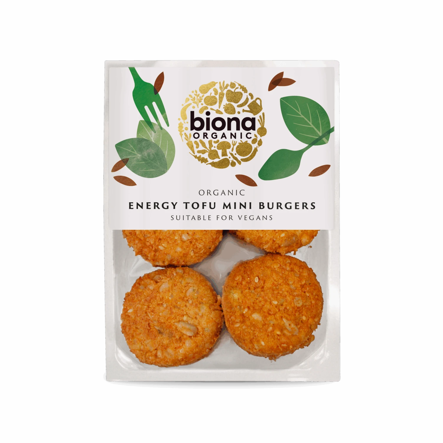 Biona mini energy burgers packed with organic vegetables and perfect when served cold as a snack or hot as part of a main meal.