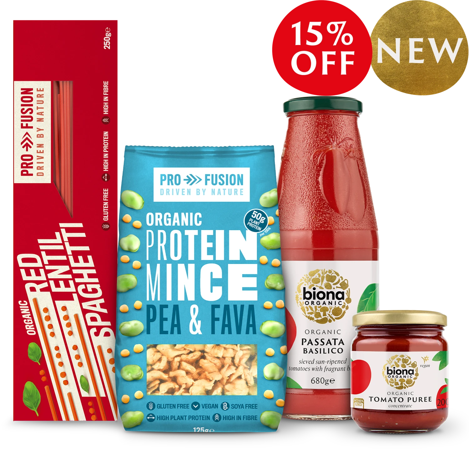 Looking for a simple and delicious way to create a high-protein, vegan meal? Our Vegan Bolognese Recipe Kit contains the key ingredients you need to make a hearty, wholesome meal in no time. Featuring products from our new Biona & Friends range, including Profusion mince and Profusion spaghetti – both of which are high in protein and naturally gluten-free, and pair effortlessly with our Biona Organic Passata Basilica sauce which is made from Italian sun-ripened tomatoes. Try our Vegan Bolognaise Recipe Kit and discover the delightful possibilities of vegan cooking!